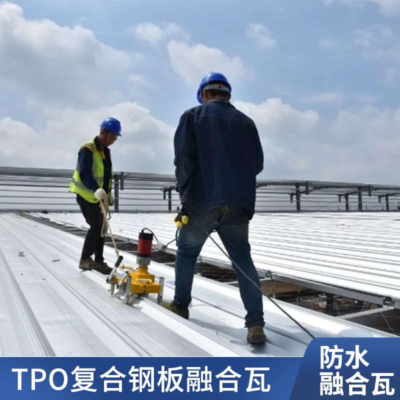 TPO/PVC鋼塑復合防水瓦以鋼板為基板,表面貼覆具有防水防腐功能的TPO/PVC卷材(熱塑性聚烯烴類防水卷材),是一款防水防腐屋面建筑材料。TPO/PVC鋼塑復合防水瓦主要特點就是在各類環境下不易生銹不易漏水,使用熱風焊接進行相連,覆蓋全部裸露的縫隙,在使用過程中可以達到蓄水不滲透的效果,防水效果好,同時還有較好的抗風揭性能和耐老化性